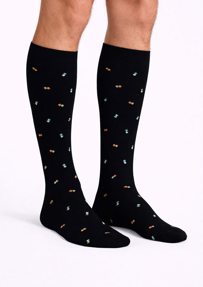 Queste calze sono un capo essenziale per l'uomo che ama aggiungere un tocco di eleganza e stile al suo look. Realizzate in una composizione morbida ed elastica, con 69% cotone, 30% poliestere e 1% elastan, assicurano un comfort senza pari durante il giorno e la sera. Con una vestibilità aderente e un tocco di eleganza, sono ideali per essere indossate con i pantaloni o le giacche in ogni stagione dell'anno.