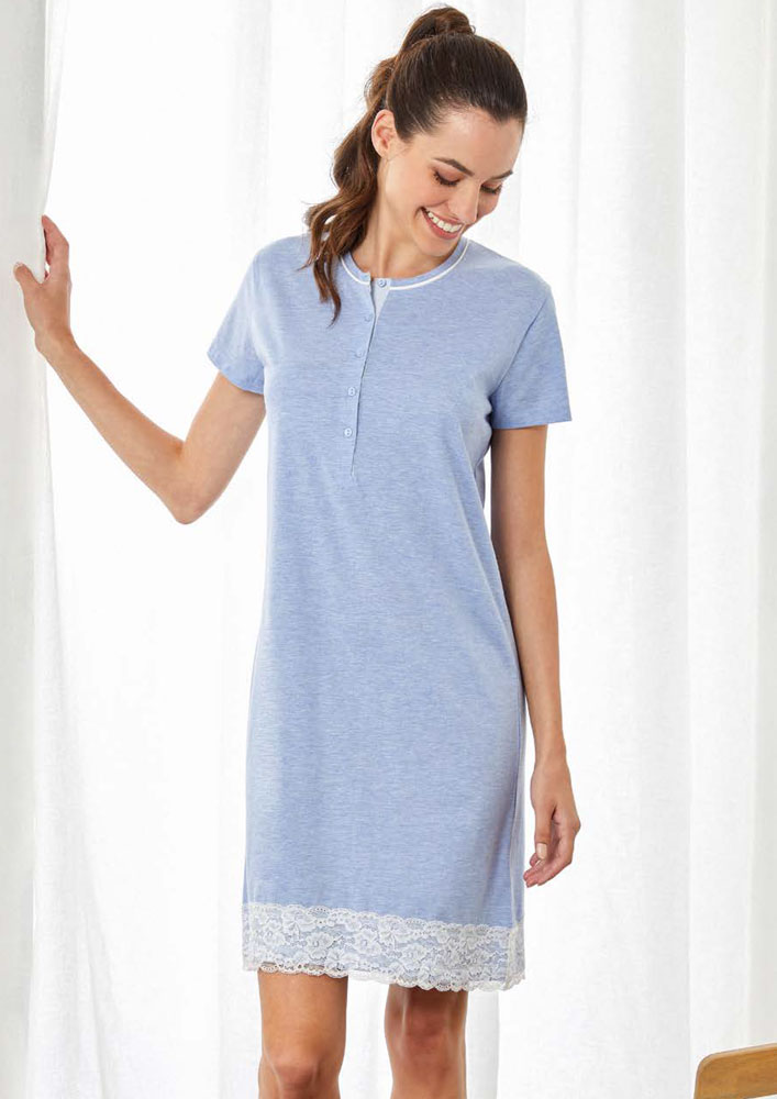 Camicia da notte manica corta donna Il Granchio, con scollo serafino e applicazione in pizzo sul fondo.