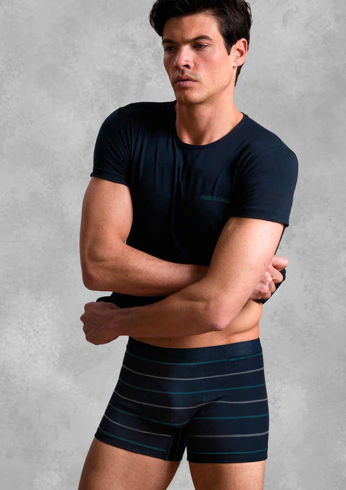Il completo intimo da uomo della linea Coveri è un capo di alta qualità che combina comfort e stile. Realizzato in cotone stretch, un materiale morbido e aderente che si allunga con il movimento, offre una vestibilità comoda e flessibile. Il T-shirt ha collo a V e maniche corte, mentre la mutanda è lunga e copre le cosce. La combinazione di questi due pezzi garantisce un look elegante e raffinato che si adatta perfettamente all’abbigliamento sportivo o per occasioni informali.