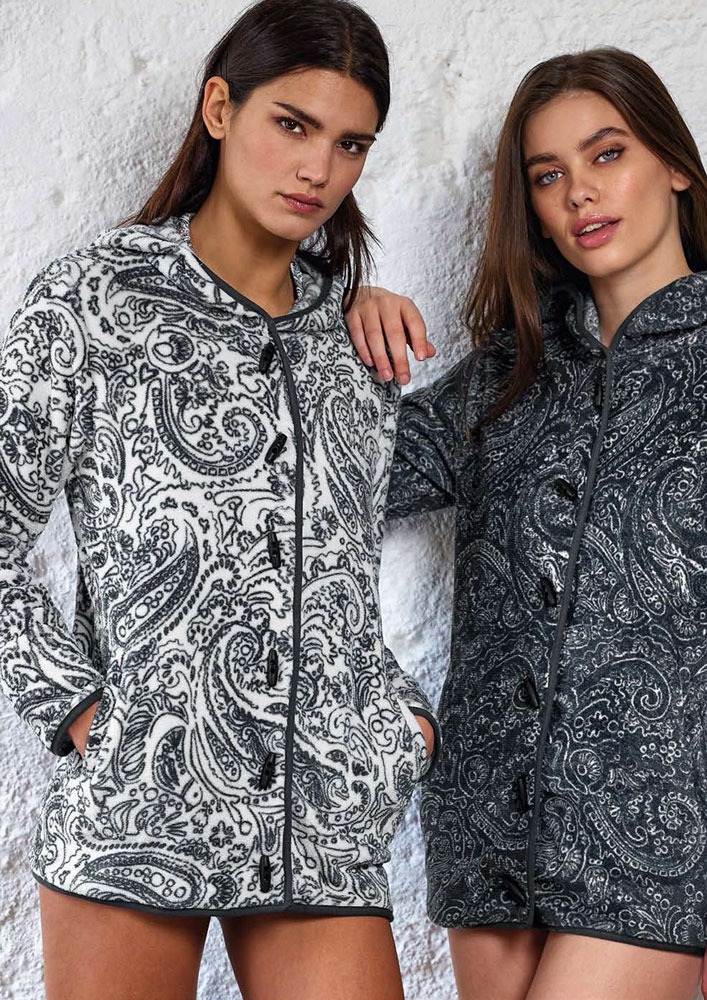 Questa giacca da camera con cappuccio per donna è un capo di moda ideale per l'abbigliamento intimo. Realizzata con micropile, un materiale morbido e traspirante, garantisce comfort e freschezza durante le ore più fredde dell'anno. La sua vestibilità offre una protezione efficace contro il freddo, mentre la composizione 100% micropile aggiunge resistenza e durata nel tempo. Il cappuccio aggiunge un tocco di eleganza e sofisticato alla silhouette.