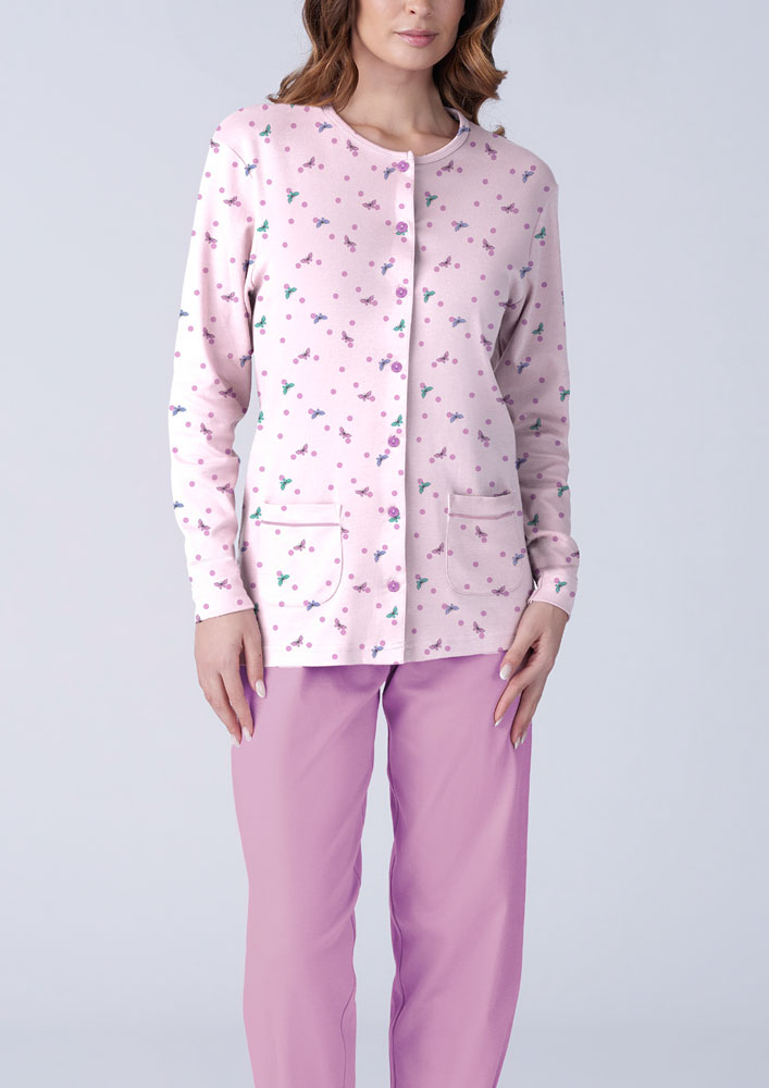 Il pigiama aperto calibrato con manica lunga della linea Karelpiù è un capo di abbigliamento intimo femminile ideale per il riposo e la rilassazione. Realizzato in 100% cotone caldo, una fibra morbida e delicata sulla pelle, questo pigiama offre una vestibilità comoda e aderente, valorizzando la silhouette del portatore. La manica lunga è ideale per coprire le braccia durante il riposo, offrendo un senso di comfort e rilassamento. Il design è arricchito da una trama raffinata con motivi floreali, che donano un effetto sofisticato e ricercato, perfetto per occasioni speciali o per dare un tocco glamour al look di tutti i giorni.