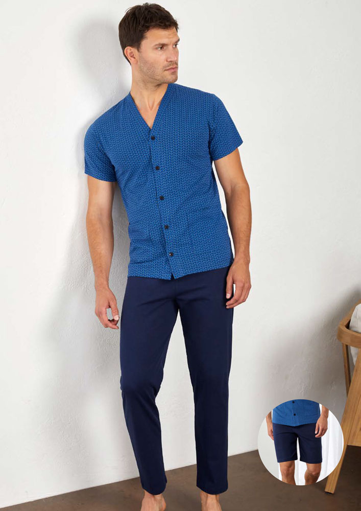 Pigiama tre pezzi aperto uomo Il Granchio. Maglia a manica corta stampata all over con chiusura bottoni e tasche. Pantalone lungo in tinta unita senza polsino alternabile a bermuda.