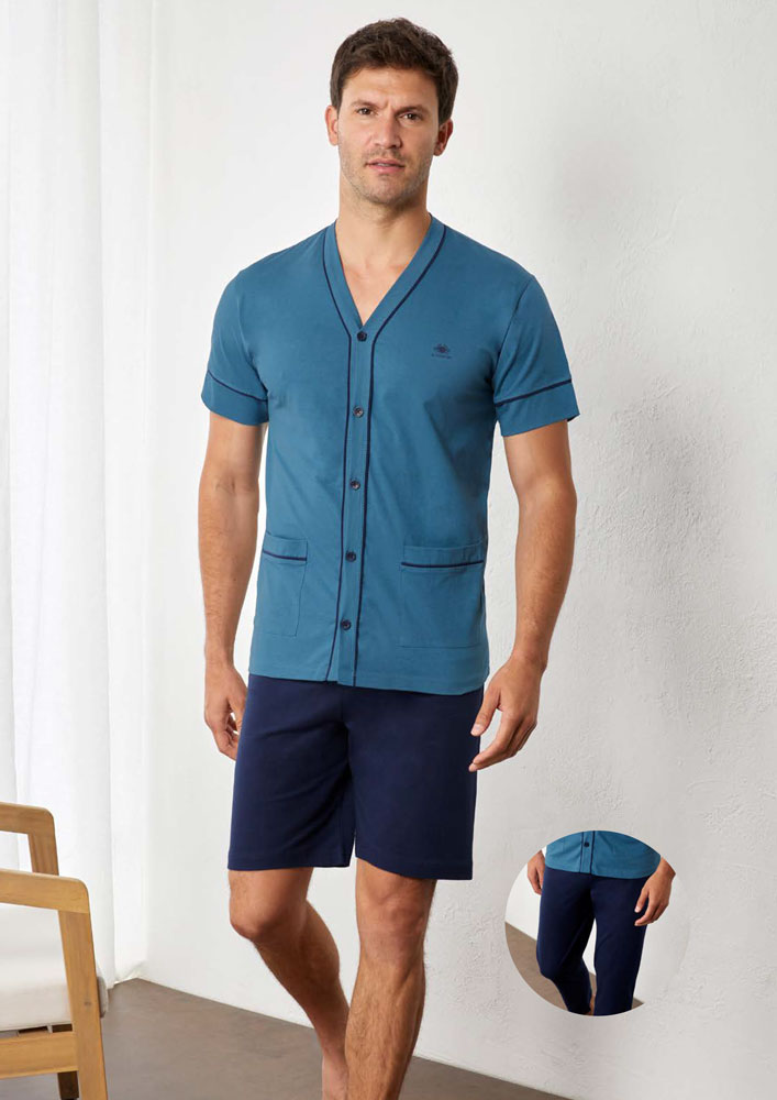 Pigiama aperto tre pezzi uomo Il Granchio. Maglia a manica corta con chiusura bottoni, tasche e profili a contrasto. Pantalone lungo dritto in tinta unita alternabile a bermuda.