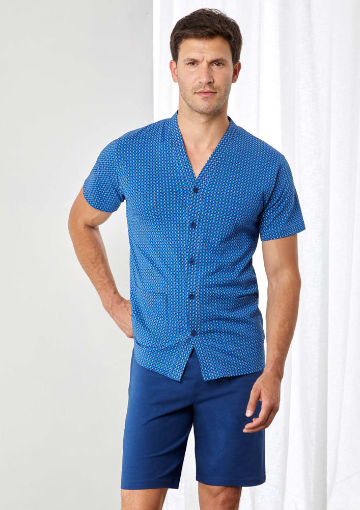 Pigiama corto aperto uomo Il Granchio. Maglia a manica corta con chiusura bottoni e stampa all over. Pantalone bermuda in tinta unita.