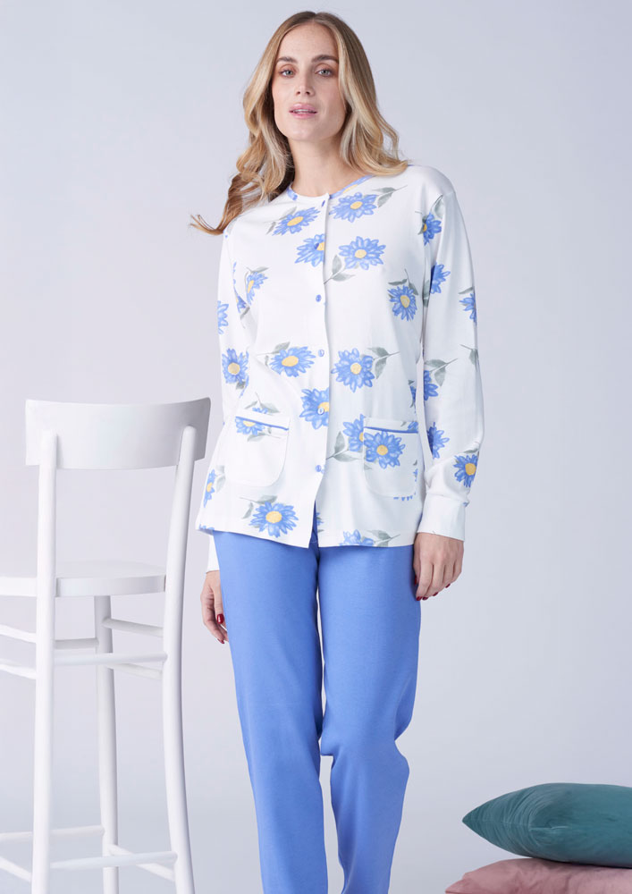 Il pigiama aperto manica lunga per donne della linea Karelpiù è un capo perfetto per il tempo libero e le attività quotidiane. Realizzato in 100% cotone, un materiale morbido, assorbente e delicato sulla pelle delle donne, avvolge il corpo con una vestibilità aderente e confortevole, valorizzando la silhouette. Il pigiama presenta un design accattivante, con motivi colorati e geometrici che donano un effetto gioioso e dinamico. Inoltre, il pigiama è dotato di maniche lunghe per una maggiore comodità e protezione durante le attività quotidiane. Il pigiama è ideale per donne adulte che amano sentirsi comode e rilassate durante il tempo libero o nelle attività quotidiane.