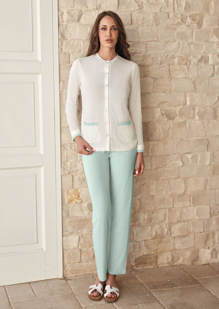Il pigiama della linea Nottingham è un capo di alta qualità e comfort, pensato per le donne che apprezzano la morbidezza e l’elasticità. La sua composizione interna a misura di 50% cotone e 50% modal garantisce una sensazione di freschezza sulla pelle, mantenendo il corpo asciutto anche durante i periodi più caldi dell'anno. Il tessuto è morbido ed elastico, assicurando un comfort senza pari per la notte. La sua vestibilità a maniche lunghe offre copertura e protezione dalle correnti d’aria fredda. Un capo ideale per chi cerca qualità e benessere durante il riposo.