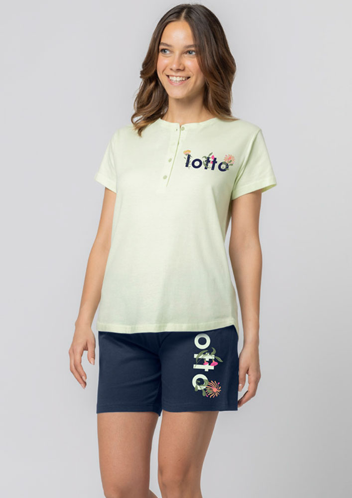 Pigiama corto donna Lotto. Maglia serafino a manica corta con logo stampato. Pantalone bermuda con stampa.