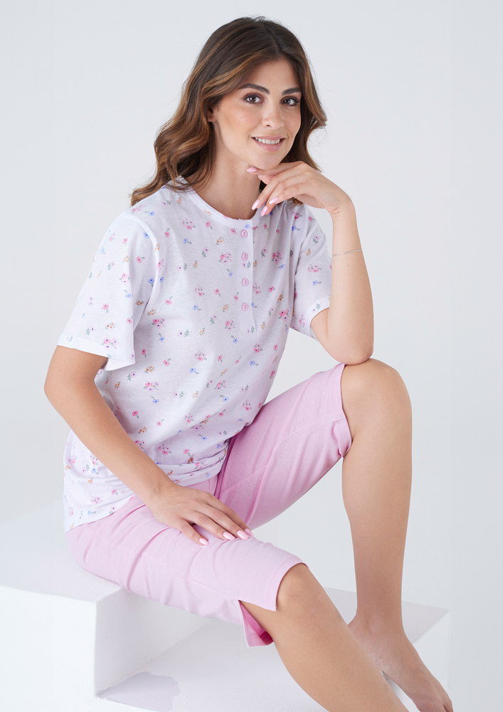 Il pigiama manica corta + pinocchietto donna della linea Karelpiù è un capo di moda perfetto per la donna che ama sentirsi comoda e elegante. Realizzato in 100% cotone, questo pigiama offre una vestibilità aderente e confortevole, valorizzando la silhouette femminile. Il design del pigiama è arricchito da un motivo floreale raffinato, che dona un effetto sofisticato e ricercato. Questo pigiama è ideale per occasioni speciali o per dare un tocco di eleganza al look di tutti i giorni.