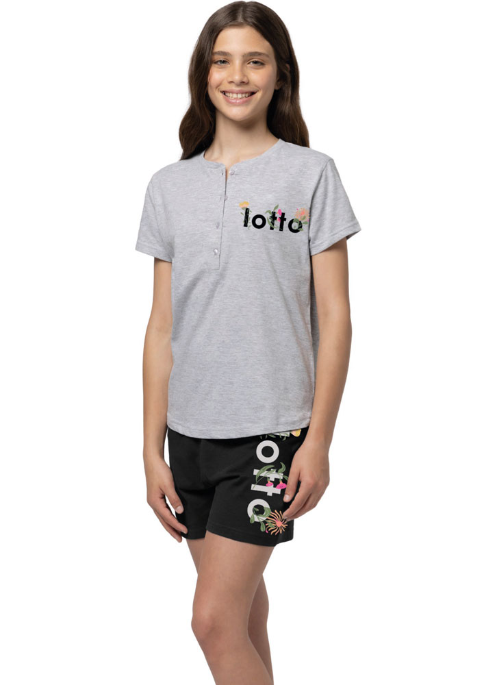 Pigiama corto ragazza Lotto. Maglia serafino a manica corta con logo stampato. Pantalone bermuda in tinta unita con stampa.