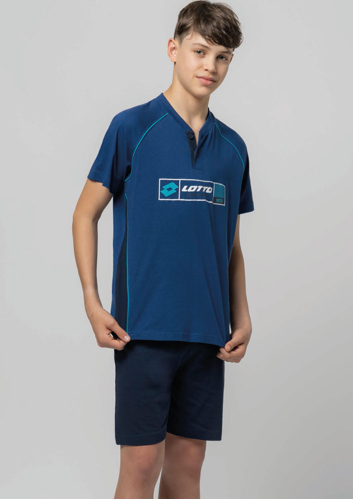 Pigiama corto ragazzo Lotto. Maglia serafino con logo stampato e dettagli a contrasto. Pantalone bermuda in tinta unita.