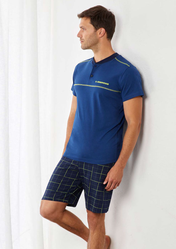 Pigiama corto uomo Il Granchio. Maglia serafino a manica corta con stampa. Pantalone bermuda stampato all over.
