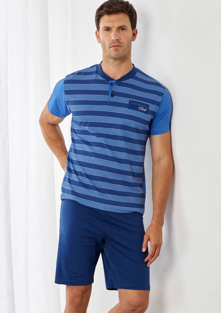 Pigiama corto uomo Il Granchio. Maglia serafino a manica corta con stampa sul fronte e maniche a contrasto. Pantalone bermuda in tinta unita.