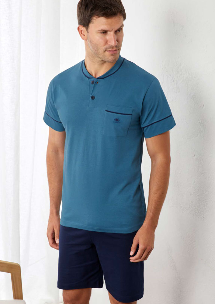 Pigiama corto uomo Il Granchio. Maglia serafino a manica corta con taschino e dettagli a contrasto. Pantalone bermuda in tinta unita.