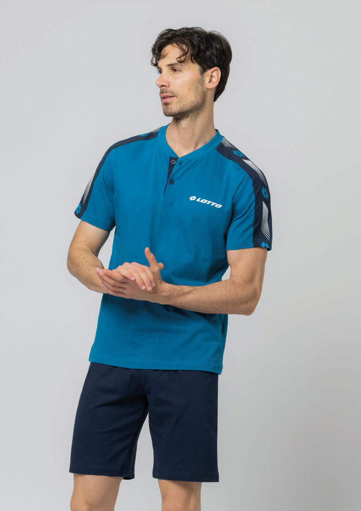 Pigiama corto uomo Lotto. Maglia a manica corta con scollo serafino e stampa sulle maniche. Pantalone bermuda tinta unita.