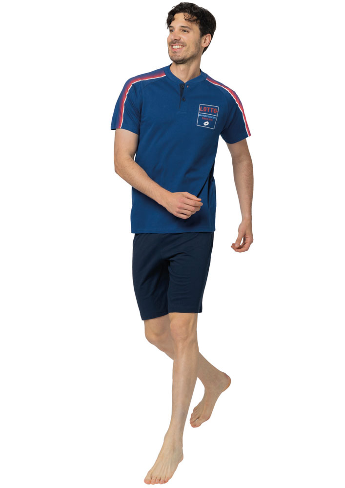 Pigiama corto uomo Lotto. Maglia manica corta con scollo serafino, logo stampato e dettagli stampati sulle maniche. Pantalone bermuda tinta unita.