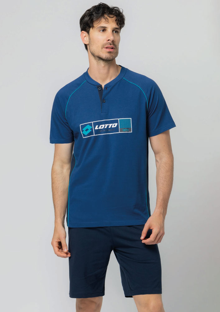 Pigiama corto uomo Lotto. Maglia manica corta raglan, con stampa logo e dettagli a contrasto. Pantalone bermuda in tinta unita.