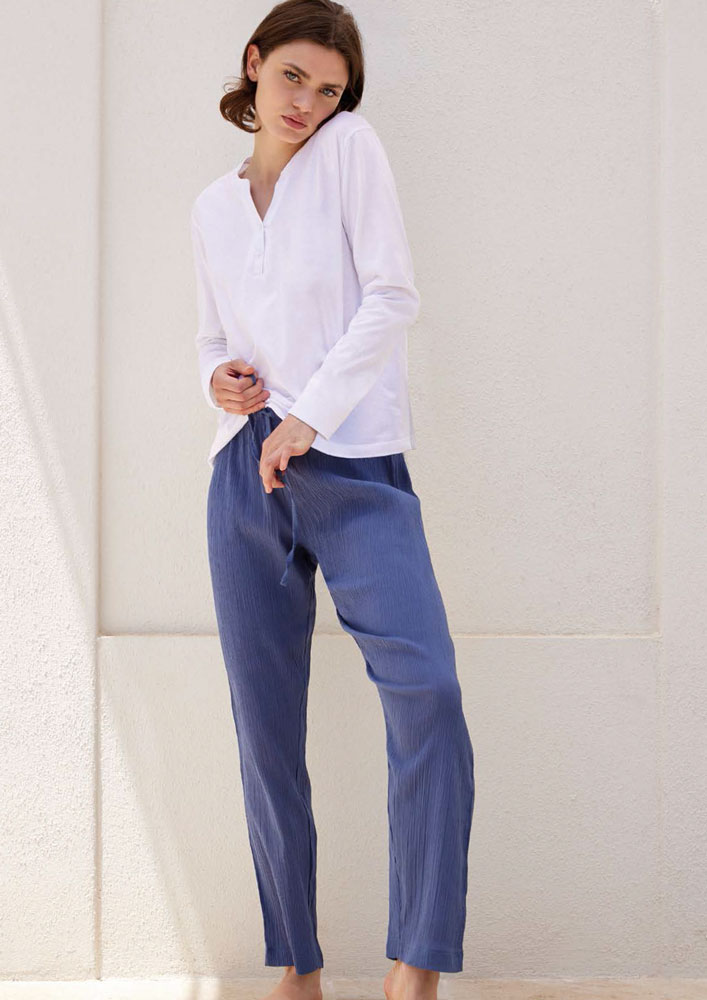 Pigiama lungo donna Jadea. Maglia serafino a manica lunga con scollo a "V". Pantalone lungo dritto con coulisse.