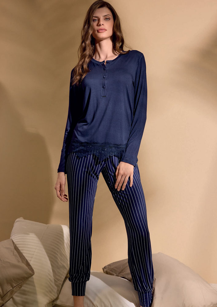 Il pigiama a manica lunga della linea Lormar è un capo di comfort e relax ideale per le serate in casa. Realizzato in viscosa morbida e traspirante, offre una sensazione di freschezza e leggerezza durante il sonno. Il tessuto è delicato e soffice, garantendo un riposo sereno e rilassante. Il design elegante e classico, con maniche lunghe e una vestibilità comoda, si abbina perfettamente ai gusti della donna adulta. Un capo di alta qualità e comfort che garantisce un riposo sereno e rilassante.