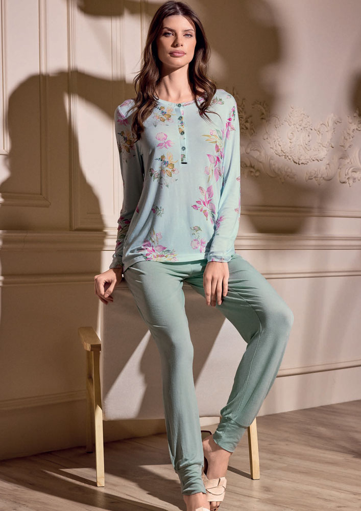 "Questo pigiama della linea Lormar è un capo di abbigliamento elegante e femminile. Realizzato in viscose morbida ed elastica, avvolge il corpo con una vestibilità aderente e confortevole, valorizzandone la silhouette femminile. La sua composizione, con 100% viscose, garantisce comfort e traspirabilità, assicurando una sensazione di freschezza e leggerezza. Il design è arricchito da dettagli raffinati e motivi floreali, che donano un effetto sofisticato e ricercato. Un capo di abbigliamento ideale per occasioni speciali o per dare un tocco glamour al look di tutti i giorni."