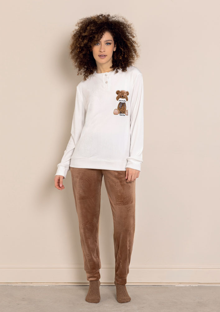 "Il pigiama della linea Nacshua è un capo di alta qualità e comfort. Realizzato in soft velour morbido ed elastico, offre una vestibilità aderente e confortevole, valorizzando la silhouette femminile. La composizione del pigiama, con materiale principale coral fleece, garantisce resistenza, elasticità e un’ottima durata nel tempo, evitando fastidi, strappi o cedimenti. Il design è arricchito da motivi floreali raffinati e sofisticati, che donano un effetto elegante e ricercato."