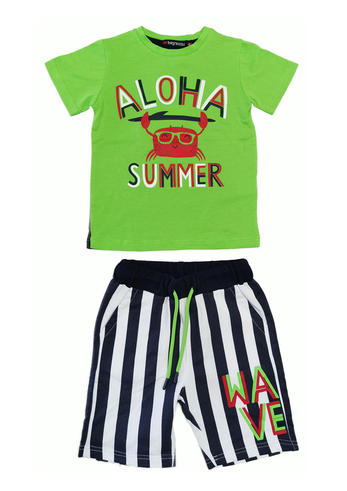 Il t-shirt e bermuda "Boyzone" per bambini tra i 3 e i 7 anni è realizzato principalmente in cotone. Questi indumenti presentano un design colorato e accattivante, con il tema Boyzone. La consegna è prevista per il mese di marzo o aprile.