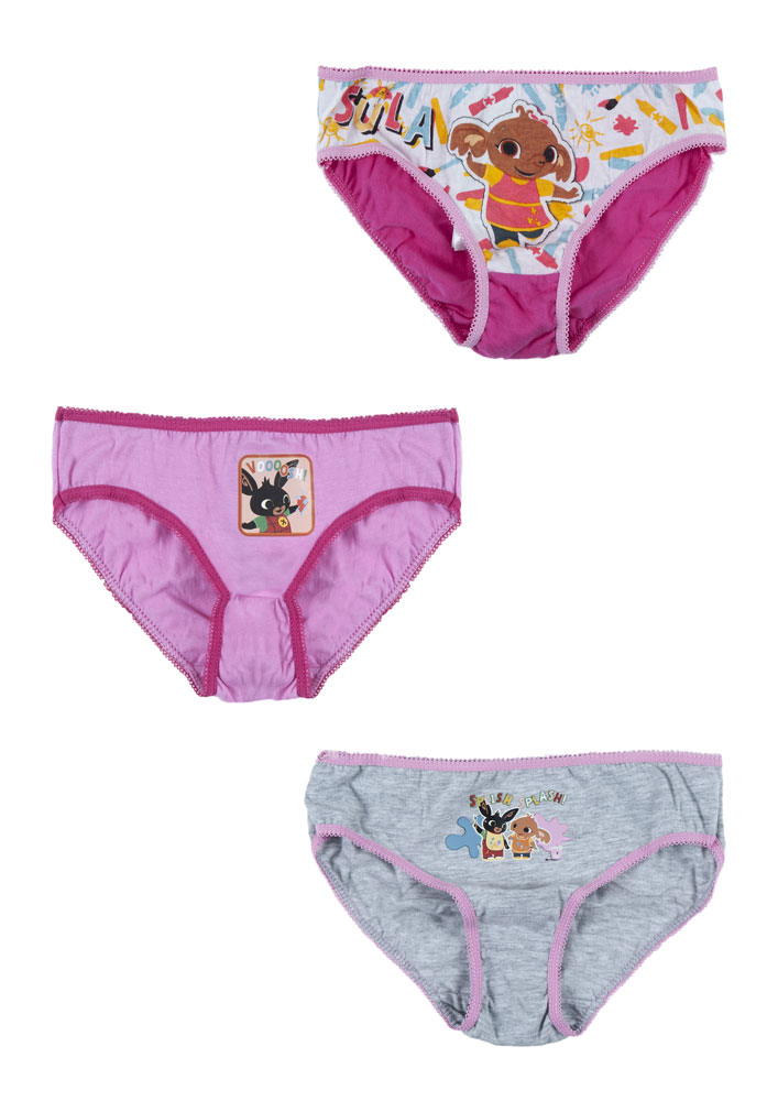 Il tripack slips femmina Coniglietto Bing è un prodotto di abbigliamento ideato per le bambine e i bambini tra i 3 e i 7 anni. Questo tripack, realizzato in cotone stretch, offre comfort e facilità di indossamento durante l'orario di riposo o il tempo libero. Il design del prodotto è ispirato ai personaggi dei cartoni animati del brand Coniglietto Bing.